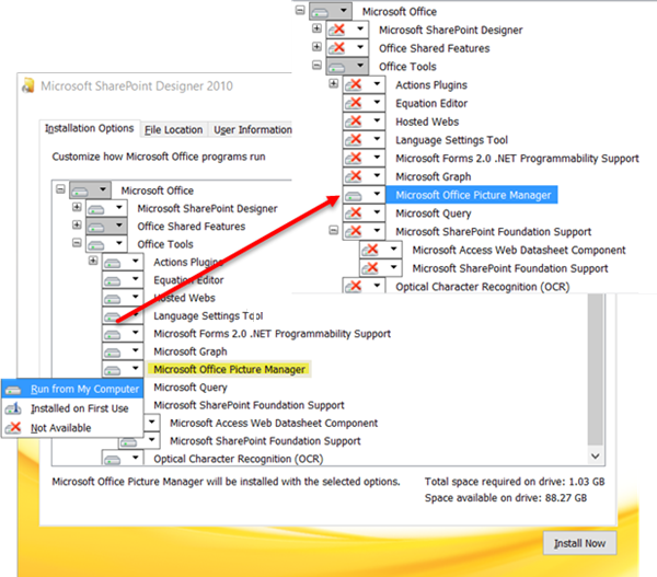 Klik panah turun bawah di samping manajer gambar microsoft office dan klik jalankan dari komputer saya.